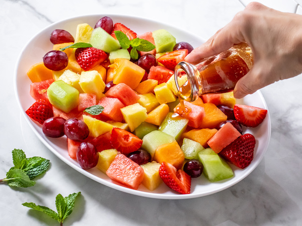 - Combine ingredients for fruit salad in a large bowl or platter. Drizzle with chilled syrup and toss gently. Top with fresh basil and mint. Serve right away.