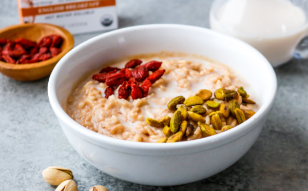 - Stir in Pique English Breakfast Tea and butter until dissolved. Pour the porridge into a bowl and top with goji berries, pistachios, and additional coconut milk. Enjoy warm.