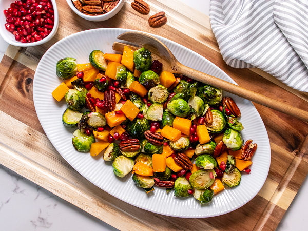 Butternut squash is full of fiber, potassium, and beta carotene. This autumn squash is slightly sweet and has a creamy texture when roasted. Sweet potatoes can also be used. Pecans toast in the oven during the last 10 minutes of baking, bringing out their nutty flavor.