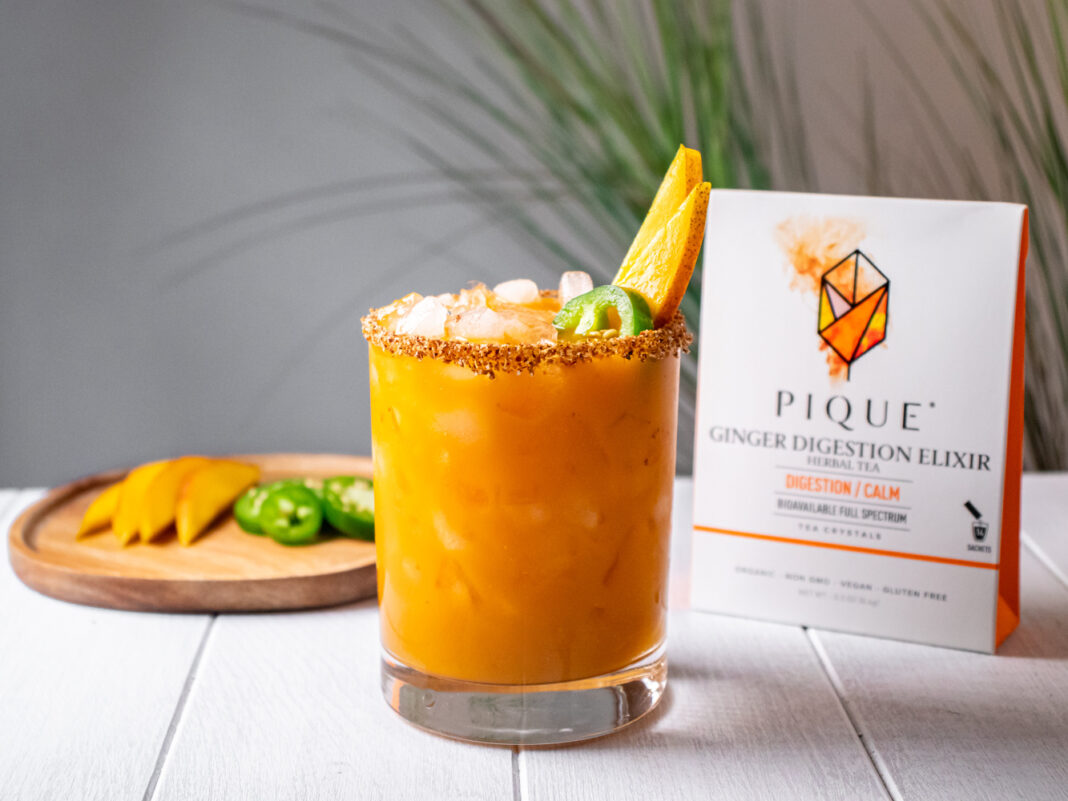 The two main flavor notes in this alcohol-free drink are mango and ginger, both of which offer an array of health benefits, perfect for keeping you looking and feeling good.