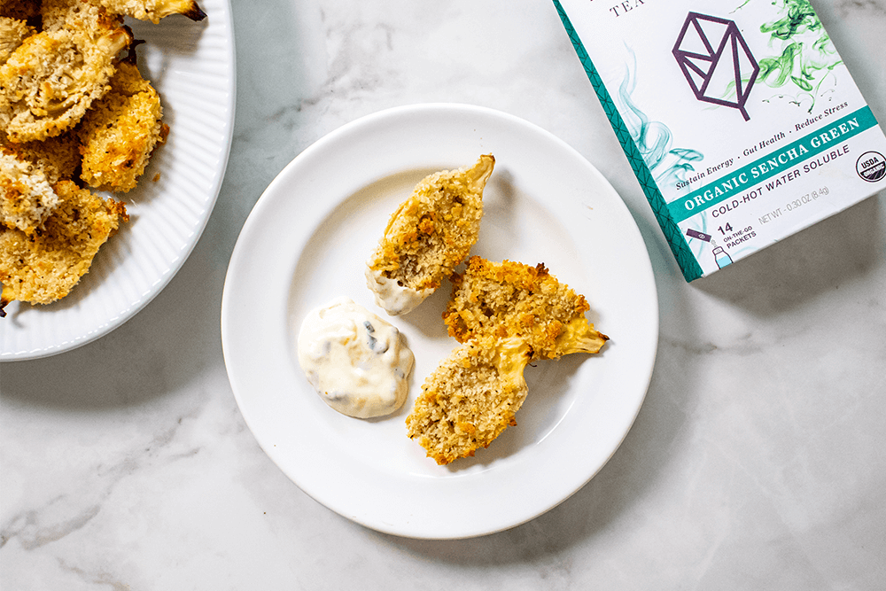 Although these artichoke hearts are delicious on their own, right out of the oven, we took the flavor one step further by adding a herby green tea aioli for dipping. All you’ll need is a high quality mayonnaise, chives, garlic, lemon and of course, green tea crystals. For a dairy-free aioli use a vegan mayonnaise.