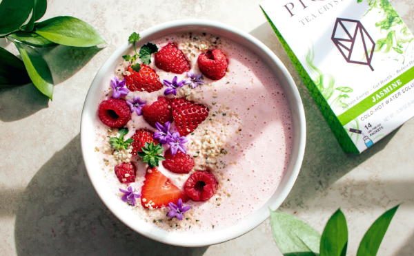 - Combine strawberries, banana, Greek yogurt, plant milk, dragonfruit powder, and Pique Jasmine tea in a blender. Blend until smooth. Pour into a bowl and top with berries, hemp hearts, and edible flowers. Enjoy right away.