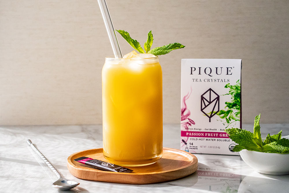- Mix together tea crystals and water in a glass until tea is dissolved. Add passion fruit nectar, coconut water, lemon juice and pink Himalayan sea salt. Stir well. Pour into a glass over ice and garnish with a sprig of mint.