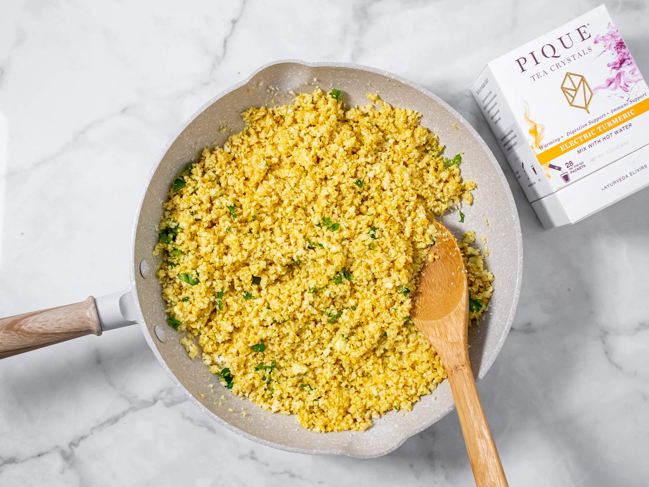 - Heat olive oil over medium heat in a medium skillet over medium heat. Add garlic and ginger. Sauté for 2 minutes. Add riced cauliflower, Electric Turmeric tea and sea salt to skillet and stir well. Cook 5 minutes. Serve hot topped with chopped parsley.