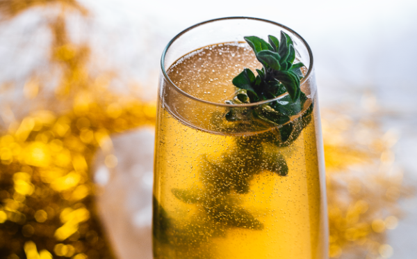 - Add a sprig of fresh oregano to each glass and then top up flutes with champagne.